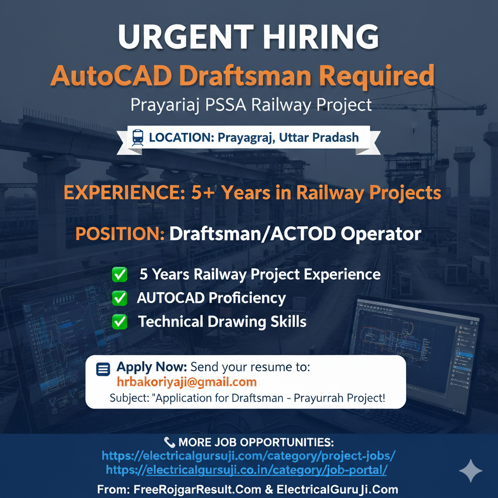 🏗️ AutoCAD Draftsman Required for Prayagraj PSSA Railway Project We are seeking an experienced AutoCAD Draftsman for the prestigious Prayagraj PSSA Railway Project in Uttar Pradesh. This is an excellent opportunity for skilled drafting professionals to contribute to a major railway infrastructure development. 📋 Project & Position Details: 🎯 Key Qualifications: 📧 How to Apply:Interested candidates should send their