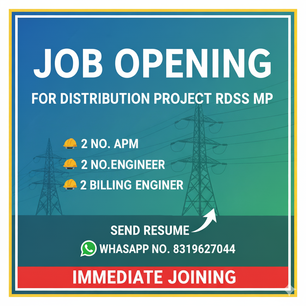 ⚡️ JOB OPENING: RDSS Distribution Project – Madhya Pradesh ⚡️ IMMEDIATE JOINING REQUIRED! We are seeking skilled and motivated professionals to join our team for the prestigious RDSS (Revamped Distribution Sector Scheme) Project in Madhya Pradesh. 📋 Available Positions 📝 How to Apply Interested candidates can apply through any of the following methods: 📲 WhatsApp Resume to: 9039491918📧 Email